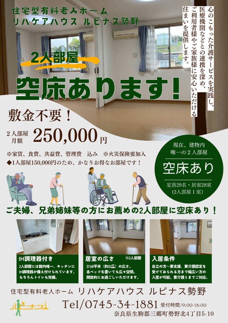 株式会社ルピナスが運営する住宅型有料老人ホーム リハケアハウスルピナス勢野の2人部屋の応募を受け付けております。