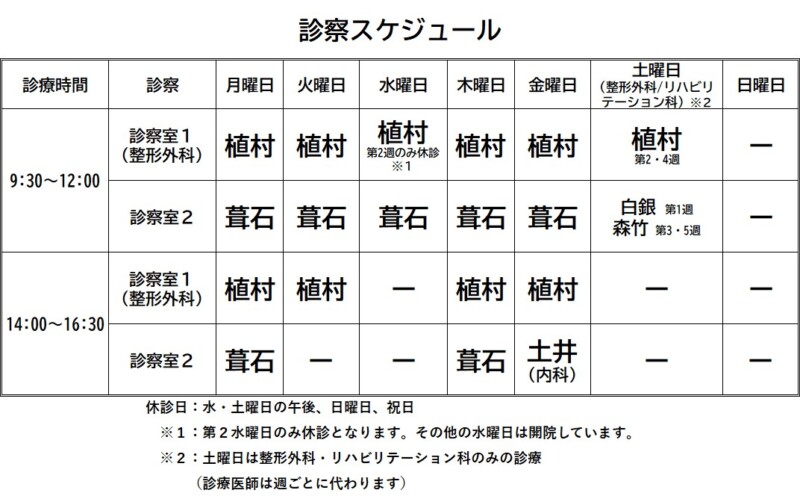 整形外科(植村院長)については、第4水曜日の午前も開院することとなりました。第2水曜日のみお休みとなります。